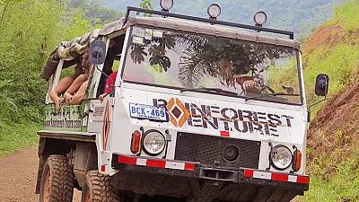 Súbase en uno de nuestros vehículos de safari 4x4 con su guía y en segundos estará dentro del bosque tropical. En minutos pasará por una pequeña cascada y subirá hacia pueblos del campo costarricense.